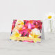 Lycklig-årsjubileum, hälsningskort på Hawaiianska. Hau'oli la Ho'omana'o. Tropiska blommor i pinkar, gult, vitt och orange finns på omslaget. Tom inuti för ett personligt meddelande. Rosa text på en banderoll med lätt gult grund på kortet. Art, image, och verse ©Shoaff Ballanger Studios, 2022.
