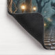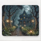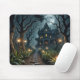 A cobblestone path winds through a dense, eerie forest illuminated by glowing street lamps, leading to a grand, Victorian-style mansion under a full moon