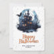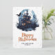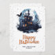 Happy halloween-kort med hemsökt mansion med fladdermus och fullt Måne. Anpassa det här Halloween-kortet enkelt med din familj namn och text.