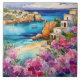 "Arches by the Sea". En idyllisk syn på ett vackert segment, med en enda båt. En liten sandstrand är inramad av ett vackert azurhav och rosa och lila blommor.