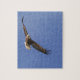 En vuxen havsörn i en skarp sväng mot en blå himmel.