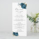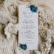 Elegant blommigt bröllop-middagsmenykort med vattenfärgstryck som illustrerar marinblå blommor med grönt.