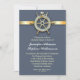 Nautisk repetitionsmiddag med blå design och gyllene band med ett båthjul.