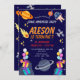 Minnesinbjudan till minneshögtiden i Äventyr. En roligt och färglös utrymmeskrävande födelsedagskalender med planeter, raketer, kometer, ballonger, presenter och stjärnor. Perfekt för ett barns speciella firande med en kosmisk stil i äventyr som upprör och gläder unga forskare.