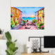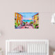 Charming AI har skapat digital vattenfärgsgrafik. party poster skylt med en by i havet med färgstarka 2 våningshus, blomkrukor och segelbåtar i solnedgång. grattis på födelsedagen är anpassadet hälsning