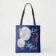 En marinblå shoppingbag med sanddollar, sjöstjärnor och sjöhästar design. Lägg till tre initialer i mallen över en vit sanddollar. Designen och monogrammet kommer att skrivas ut på båda sidor. Gör en perfekt present till alla som älskar stranden!