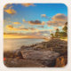 Havsolnedgången över stenar och gömma i handflatan underlägg papper kvadrat