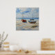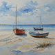 "Havsreat". Resten av vågar ligger vid kusten av detta fredliga sjölandskap, där båtarna vilar stilla på stillastående sand, under ett stillastående blå himmel. En färgstark stiliserad vattenfärg i mjuka blues and sand färg.