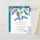 Blå, turkos och gula havssköldpaddor med tropiska blad pryder denna havs- och strandlivsbröllopsartikel. Textmallfält på båda sidor gör det möjligt att lägga till alla dina ytterligare detaljer, inklusive svar, gåvoregister, mottagningsdetaljer, vägbeskrivningar med mera.