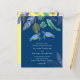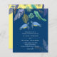Blå, turkos och gula havssköldpaddor med tropiska blad pryder denna havs- och strandlivsbröllopsartikel. Textmallfält på båda sidor säkerställer att du kan lägga till alla dina ytterligare detaljer, inklusive svarsadress, gåvoregister, mottagningsdetaljer, vägbeskrivning med mera.