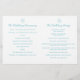 En enkel kontur av teckning i vitt och blått av en stjärt/havsabborre, med grafiska vågvirv, en vacker blå grönt och ett vitt färg-bröllopsprogram. Fashionable modern strand stil bröllop är en del av havsstjärnan bröllop stationär station. Söt pastellskuggor blått och akvblått på sandkrämbakgrund. Redigera det här bröllopsprogrammet med ditt eget namn, data, ceremonins ordalydelse, bröllopsfestens assistenter och tack. Ett enkelt program för elegant ersätter bara exempeltexten med bröllop-informationen och delar upp program till hälften vid leverans. Ett perfekt bröllopsprogram för en strand, ett kusthav som inspirerats eller ett havs-destinationsbröllop. Unik teckning och design av Sarah Trett.