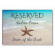 Bröllopmottagningen reserverade sittkort på ett strandtema. Vackert blåhav vatten med vinkara som överlappar stranden är bilden bakom den svarta texten i anpassningsbar. Anpassa alla tre linjer, med "reserverad" text överst, namn under det och rubrik vid grund. Reservera platser för medlemmar av bröllopsfesten och speciella familjemedlemmar med dessa kort.