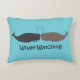 Blå kudde med tecknad valar ovanför ord Whale Watching. Baksidan av kudden är ett vackert blått rand mönster.