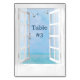 Akvarell havsutsikt genom öppet vitt fönster med genomskinliga gardiner och måsar för bröllopsmottagning.