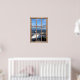 Poster som ser ut som ett fönster - vinkar och strand Sätts av havets vinkara syn när de bryter mot stranden i en vit sjöfågel. Se en vågkollision mot ett stort sten. Sol värmmade sten från förgrunden till den här scenen, medan moln över tävling på blåkvällen i himlar. I avstånd kan man spionera på fraktaser, och på motsatt kusten finns backe. Den här vackra havsscenen är inramad av ett träfönster för att skapa en havsvy på väggen.