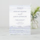 Moderiktiga och moderna bröllopinbjudningar i blått och vit med vattenfärghav vinkar.
