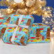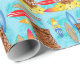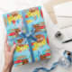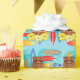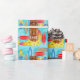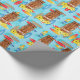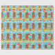 Hawaianska Tiki maskerar med gula hibiskusblommor på dess baserar, den statliga blomman av Hawaii med ett bakgrundsmönster av retro surfingbrädor.
