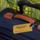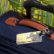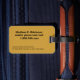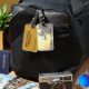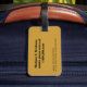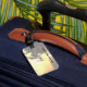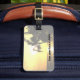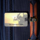 Märkre för ID för Hawaii temabagage. Dessa hänger lös resväskan märkresärdrag en hawaiansk solnedgång med palmträd längs havshorelinen. Attraktiv guld- färg på bakkoordinaterna med fotoet.