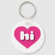 Den här nyckelringen har ett pulserande shock rosa som innehåller det feta, vita, rundade nedre brev hi, en lekfull förkortning för Hawaii, alabaha-staten.