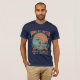 Catch the ultimate wave with this stunning retro Hawaiian surf graphic tee. Featuring a bold surfer riding a massive curling ocean wave under a glowing sunset, framed in a rope circle badge with tiki masks, seashells, and tropical palm trees — all rendered in that gorgeous faded vintage surf style.