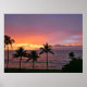 Tropiskt solnedgångsfoto från Hawaii på ön Maui. Bild ligger i handflatan träd i silhuett med vackra himlar av rosa, lila och orange och avlägsna berg med lila hav. Detta vackra bild av paradiset kommer att göra er tänka av varma tropiska brons på stranden.