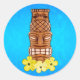 Hawaiian Tiki Mask med gult hibiscus blommor på basen, delstatsblomman från Hawaii med havets blå bakgrund.