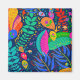 Hawaiisk trädgård, tropisk djungel, karibiska papegoja, rödblå gult, grönt rosa violett, blommigt bladverk, gömt papegoja, tropiskt färg, Virginia Vivier, Vagabond Folk Art, alalikokonst, modern boho decor, tropisk deka.
