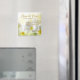 Söt plumeria Hawaiian sparar datumet bröllop magnet. Plumerian för vit och gult är den tropiska blomman med textmall för personlig för namn av paret, bröllop-datum och öar för att hjälpa gästerna att planera för transport till eller mellan öarna.