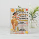Supercool och retro Hawaiianska Luau Bröllopsfestinladningar med en vintageillustration av en vacker hulaflicka som välkomnar dig till en bröllopsfest. Rolig typografi, blommor på en väderbiten träbakgrund.