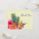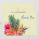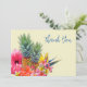Tropiska blommor och ananas tack-kort. Platta, blekgula kort med hawaiianska blommor på framsidan. Hibiskus, plumeria / frangipani och paradisfågelblommor är alla en del av designen med två ananas i mitten av blommorna. Mörkblå textmallar på fram- och baksidan är lätta att anpassa efter behov. Inkludera ett meddelande och signatur på baksidan över en paradisfågelblomma bakgrund.