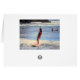 Surfare åker vågar utanför kusten på Stora ön Hawaii. På baksidan av kortet rinner en kvinnlig surfare ut på stranden.
