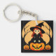 Söt illustration av en ung häxa med orange hår omgiven av jack-o'-lanterns. Den magiska atmosfären framhävs av fladdermöss som flyger under en full orange måne, vilket skapar en lekfull Halloween-stämning.