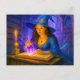 En häxa sitter i ett gammalt bibliotek och utövar magi med en glödande lila kristall över en öppen trollformelbok. Rikligt detaljerad fantasiscen