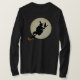 Silhouetten av häxan på en broomstick med avfyrar kommande ut ur kvasten och en svart katt perched på handtaget mot en rundafullmåne.