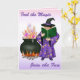 Sött Halloween-motiv med en liten häxa och hennes trollformelbok. Hon har en häxhatt och -kappa med symboler och en magisk kittel. Korttexten säger ... Känn magin, delta i festen.