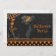 Roliga, söta Halloween-festligheter för barn, familj och vuxna med en söt svart katt i en häxhatt som sitter bredvid fantasifulla häxben i groovy orange och svarta randiga strumpor och fötter i funky svarta lockiga tåstövlar. Bakgrunden är en elegant svart vintage grunge shabby chic damask med en orange prickig kant och tryckt svart spets. Observera: Alla inbjudningar på Zazzle-webbplatsen har platta tryckta bilder. Roliga, snygga och humoristiska häx-inbjudningar för barn-, familje- och vuxenfester. All text är helt anpassningsbar / anpassningsbar för att passa dina behov - massor av typsnitt och färger att välja mellan. Dessa fantasifulla inbjudningar är illustrerade på båda sidor