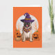 En söt pug hund som bär en häxhatt och en skallig bandana, sittande på en kvast, flankeras av utskurna pumpa jack o lanternor. Söt etikett för dina Halloween-kort.