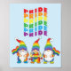 Denna söta vägg poster med tre gnomer klädda i regnbågskläder och med regnbåge i flaggor och ett regnbåge. Typografin säger "PRIDE", i ett vågigt teckensnitt som använder regnbågens färg.