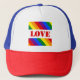 HGBTQ+ Square Rainbow Flagga med Kärlek Truckerkeps - LGBTQ+ Rainbow Flagga för Pride Month - är en människokärd design som sömlöst upprepar Rand Rainbow Flagga för Rand Pride Firande. Färg här i flagga är rött, orange, gult, grönt, blått, violett.