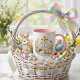 Celebrate the miracle of Easter with this beautiful faith-inspired mug. A radiant wooden cross glows above the heartfelt message "Made New" in elegant script, surrounded by a lush floral wreath, a sweet sleeping white bunny, pastel patterned Easter eggs, a delicate butterfly, and a stone tomb entrance. Below, "He Is Risen" completes the powerful reminder of resurrection hope.