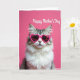 This card shows a fluffy long-haired cat centered in the design, staring forward with a calm, slightly serious look that feels oddly affectionate. Heart-shaped glasses in a bright pink tone sit on its face, adding a sweet, friendly wink of romance ❤️. The fur mixes silvery gray tabby markings with a big white mane around the cheeks and chest, giving the portrait a soft, cozy contrast. Behind the cat is a solid fuchsia background that keeps the focus tight and makes the glasses stand out. Near the top, the words “Happy Mother’s Day” appear in white flowing lettering, easy to spot against the pink. A thin white border with a lightly sketched texture frames the scene, like a gentle outline around a photo. Soft lighting smooths the background while catching tiny highlights on the glasses and the cat’s fur 🌼. The heart-shaped lenses are glossy fuchsia, matching the background while staying clearly defined around the cat’s eyes.
