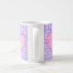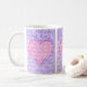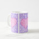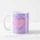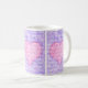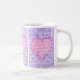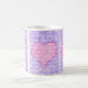 Ett söt kaffe mugg för någon speciell med tre paneler som innehåller ett rosa hjärta på en violett blå bakgrund. Ord, "I kärlek you", är skrivet över hela mönstret med vitt skript.