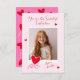 Cute Valentine's day greeting cards with photo, red heart lollipop and pink bow illustration. Bright lollipops pattern. Modern script lettering "You're the sweetest valentine". Pink and red colors. You can customize card with your text and photo.