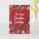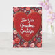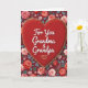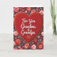 This greeting card shows a large red heart in the center, shaded to look slightly rounded, with a gold dashed outline like stitched thread. Inside the heart, white flowing lettering reads “For You Grandma & Grandpa,” placed across the middle so it’s the first thing you notice. Just below the words, two small gold hearts link together as a quiet sign of lasting love. Behind the heart is a deep maroon background filled with roses in soft coral and pale pink, plus tiny white and light blue flowers. Teal and sage green leaves curl around the blooms, making the whole scene feel full and cozy without being busy. It feels meaningful to give because it says “we love you” in a simple, caring way that fits both romance and long-time togetherness 🥰. It’s a sweet choice for reminding Grandma and Grandpa how much they’re appreciated on Valentine’s Day ❤️, and for sharing Valentine’s Day sentiments.