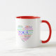 En mugg med inspirerande ord kopplad till yoga, placerad i hjärtform