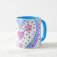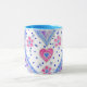 En söt och romantisk ringsignal mugg med pulverblå fälg och handtag och en design av rosa och blått ro och hjärta, från en originalmålning av gul Adamson. Denna design finns även på hälsningskort och olika presenter.
