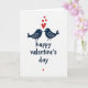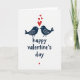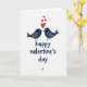 This greeting card shows two stylized birds in deep navy blue on a bright white background. They face each other with their beaks almost touching, like they’re about to kiss, which feels sweet and close. Each bird has small white dots and curved marks on its wing that add a gentle, patterned detail. Above them, three red hearts float upward, with one larger heart leading and two smaller hearts following. Below the birds, the words “happy valentine’s day” appear in navy blue in a casual brush-lettered style, centered near the bottom. A tiny red heart sits under the words, like a quiet finishing touch. It’s a simple way to show affection and care, whether you’re sharing romance or friendship 🥰❤️. Hope it helps you share Valentine’s Day sentiments with someone you care about.