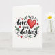 This card features the words “Love you darling” centered on a white background in flowing black lettering that looks like it was drawn with a pen. The “o” in “Love” is replaced by a large red heart with a thin black outline, making the message feel extra sweet ❤️. Around the main words, several smaller red hearts are scattered like little reminders of affection. Dark green leafy sprigs sit between the hearts and letters, adding a gentle, natural touch to the layout. Tiny red dots are sprinkled across the background, like confetti or berries, giving the whole design a light, happy feel. The mix of red, black, and green keeps it simple while still feeling full of love. It’s a meaningful card to give because the message is direct and tender, and the hearts make it easy to say what you feel 🥰. Hope it helps you share Valentine’s Day feelings with someone you care about.