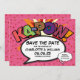 Med kärlek-hjärtekonfetti inspirerade en roligt, coola och trendig tecknad bok till att spara datumkortet som lägger graset, kranen och pow i bröllop-datummeddelandet. Den omvända funktionen har en matchande kärlek-hjärtan som konfronteras med en rosa tecknad bok polka-punkt mönster som du kan ersätta med en egen bild eller ett eget foto. Designad av Thisisnotme©