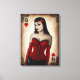 Pinup stil-drottning av hjärtedesign med graverande effekter. En illustration av en vacker ung kvinna, med långt svart hår, med röd korsett.